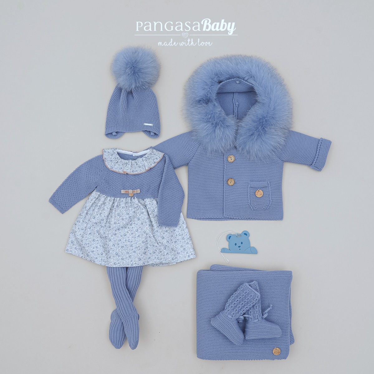 Comprar vestido para bebé fabricado en punto, color azul bruma. Collection Bleu Brume, fabricado en España de la Marca Pangasa.