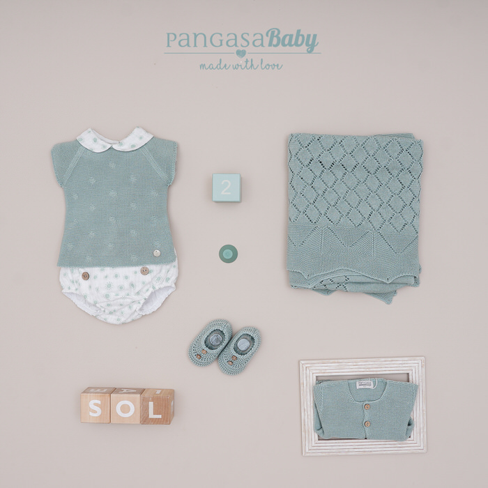 Modelo para bebé, fabricado en punto fino y tela con soles, en color verde mint, botones en la espalda.