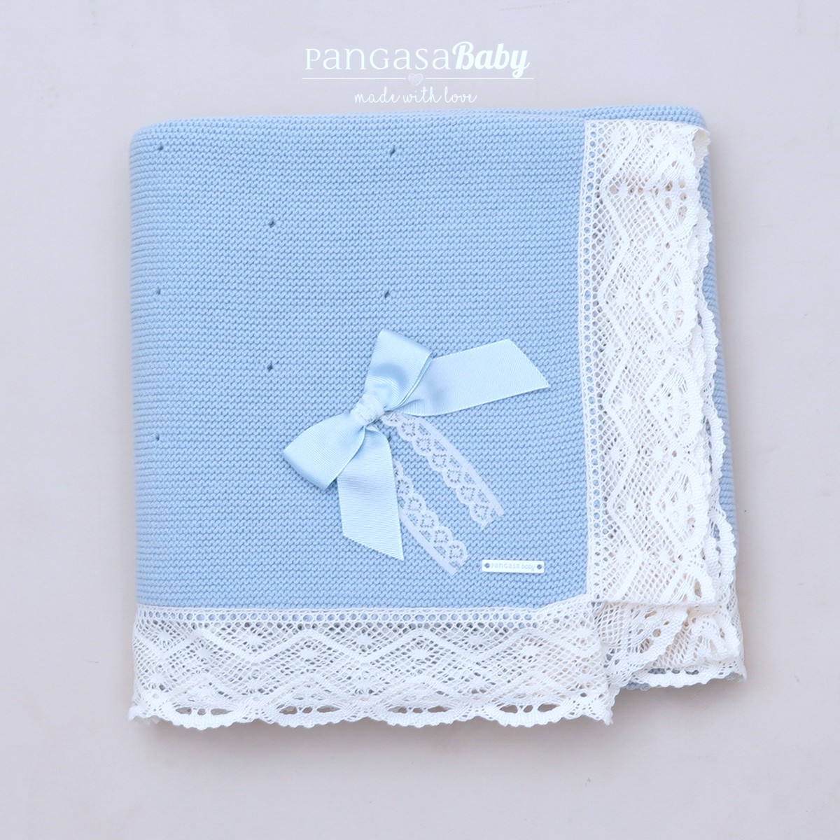Mantita para bebé en celeste empolvado, con puntilla en color marfil, con la mejor calidad para la piel de los más pequeños, de Pangasa