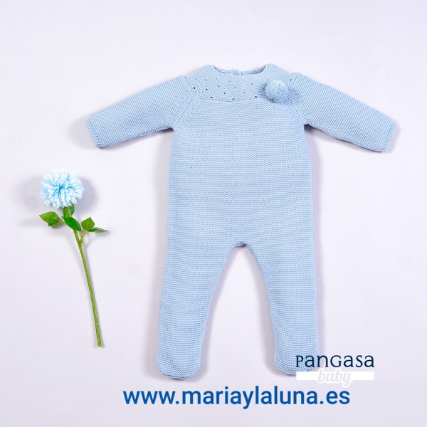 Pelele para bebé, fabricado en punto, en color celeste empolvado, botones en la espalda. Con la mejor calidad, de Pangasa.