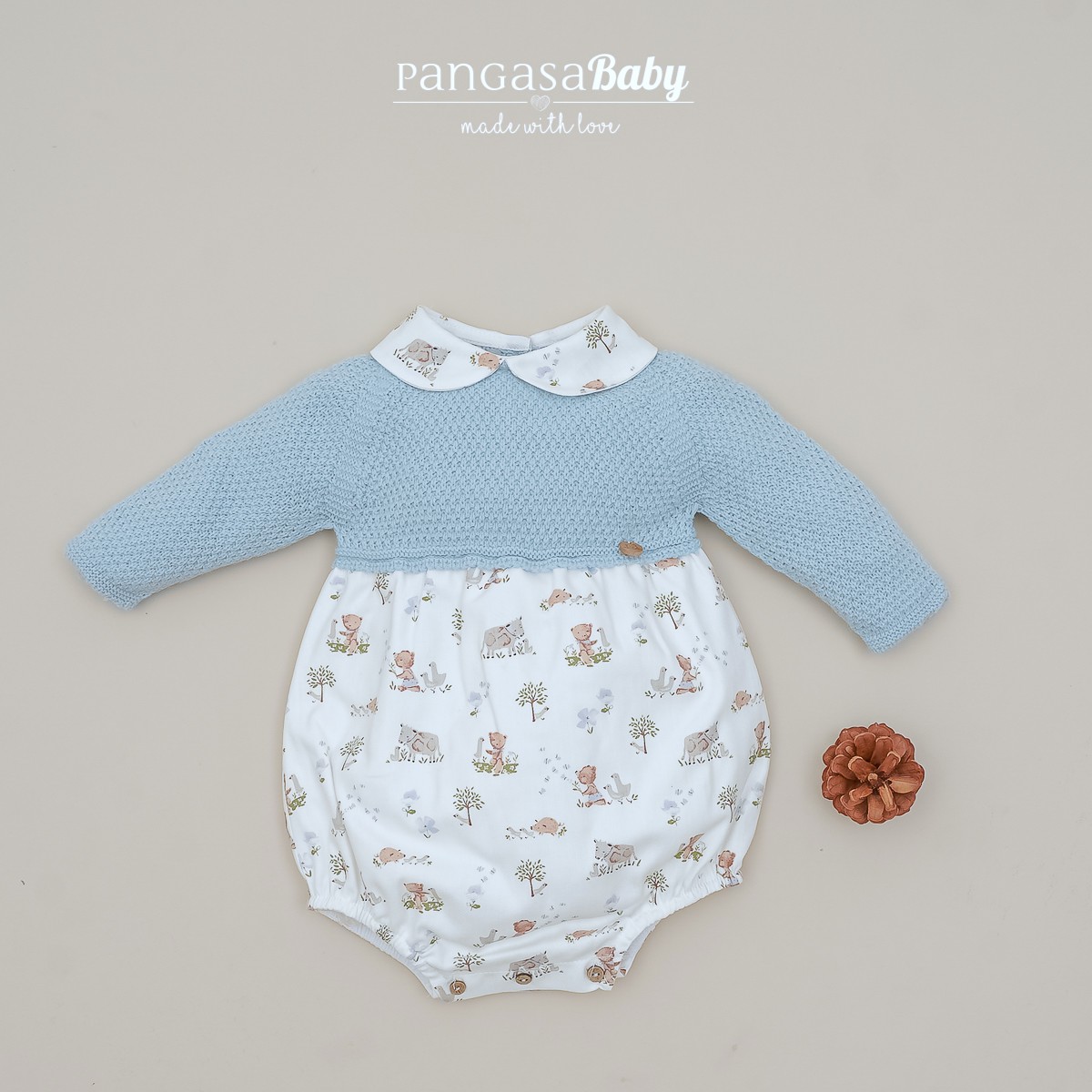 Modelo para bebé de punto en color celeste empolvado y tela de ositos, forrado, botones en la espalda y en apertura para quitar facilmente el pañal.