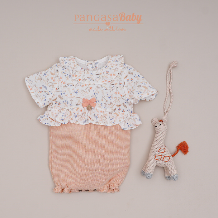 Pelele para bebé, fabricado en punto fino en color melocotón, y tela, botones en la espalda.