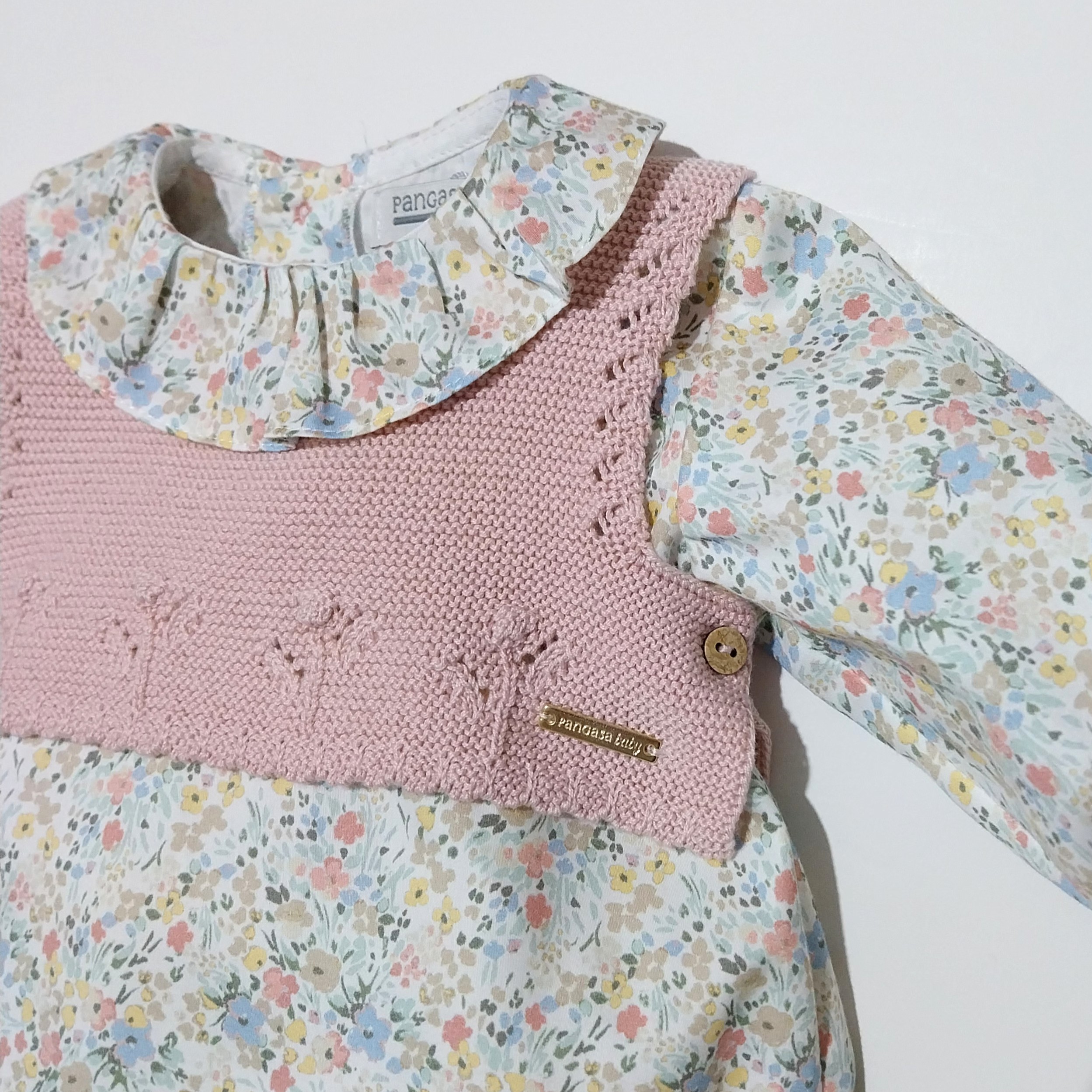 Modelo para bebé, chaleco fabricado en punto fino y pelele en tela de flores, en color rosa empolvado, botones en la espalda y en apertura para quitar facilmente el pañal.