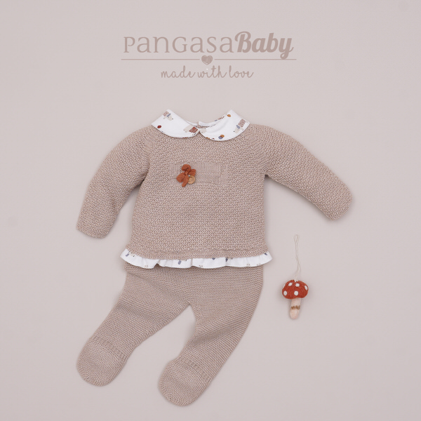 Jersey recto y polaina para bebé, fabricado en punto, en color arena, polaina sin costuras y botones en la espalda.