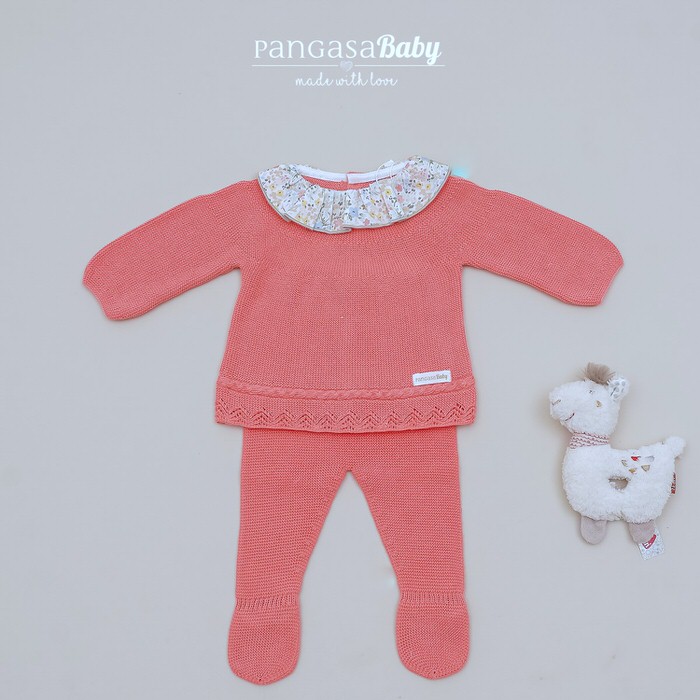 Jersey y polaina para bebé, fabricado en punto fino con cuello de tela de flores para primavera y otoño, en color coral, polaina sin costuras y botones en la espalda.